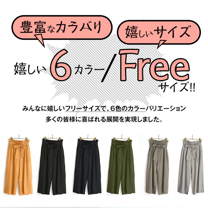 グレンチェック リボンベルト ワイドパンツ ガウチョパンツ ガウチョ レディース ウエストリボン 楽ちん ボトムス おしゃれ 可愛い ブラック ホワイト カラバリ豊富 メール便 秋冬 2017秋冬新作 フリー 【lgbt-ad0910】【即納:2-5日】メ込