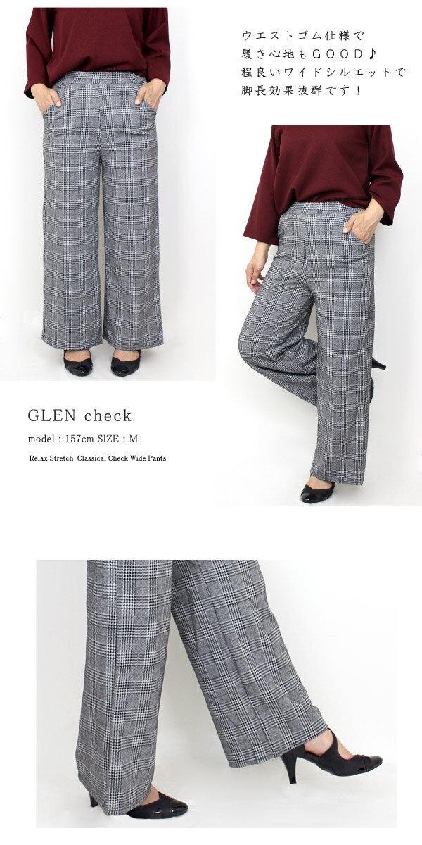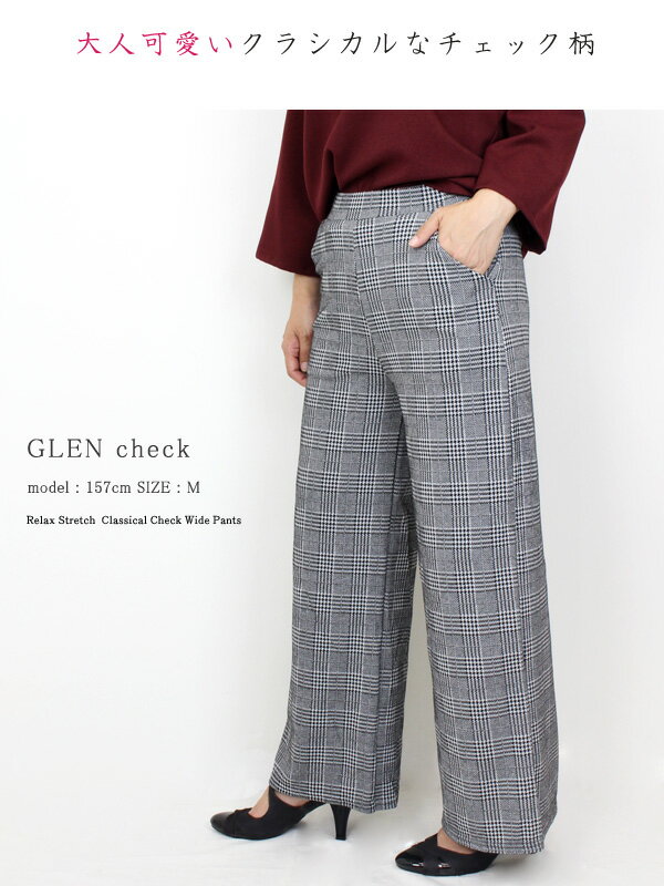 【 メール便送料無料 】 クラシカル チェック ワイドパンツ ウエストゴム ストレッチ 大人可愛い シンプル 美脚 脚長 小尻 秋冬 快適 オフィス カジュアル ストレスフリー 大きいサイズ グレンチェック ギンガム レディース